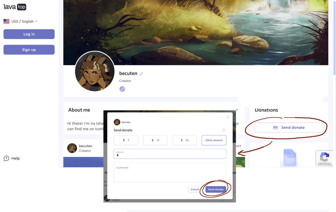 Click on send donate, choose how much you want to send and fill in the payment field (both PayPal and Cards available).